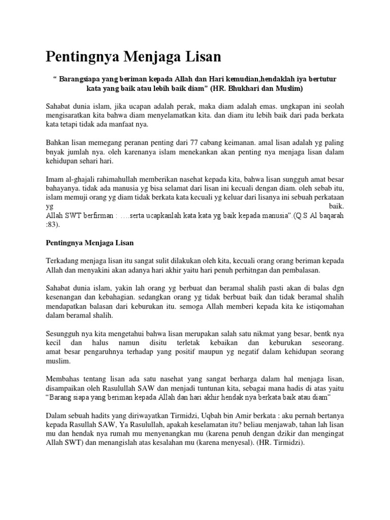Dan jika ringkas itu dirasa kurang maka memperbanyak perkataan wajib dilakukan. Menjaga lidah bukan sebuah perkara mudah apalagi saat dikuasai emosi dan amarah. Kata mutiara islami tentang menjaga lisan Ada ungkapan dalam pepatah arab yang mengatakan Lisan itu mampu menembus apa yang tidak mampu ditembus oleh jarum.
