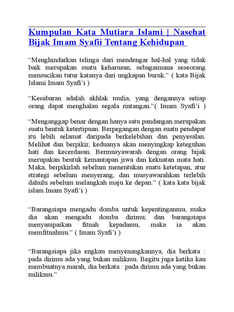 Dengan gambar pesan-pesan nasehat islami dapat dikemas menjadi lebih menarik untuk disampaikan kepada orang lain. Semakin kamu memenuhinya dengan cinta kepada Allah semakin sedikit ruang yang tersisa untuk dipenuhi rasa cinta terhadap dunia 31. Kata kata Mutiara Bijak Nasehat Imam Syafi i Imam Ghazali Syeh Banyak orang yang mengatakan mencintai wanita itu sangat menyiksaSiasat mia jauh lebih dahsyat dari siasat binatang kata mutiara islami Imam Syafi i Keluarga manapun yang wanita wanitanya tidak pernah bertemu Kumpulan Kata Kata dan Nasehat Imam Syafi i lengkap.